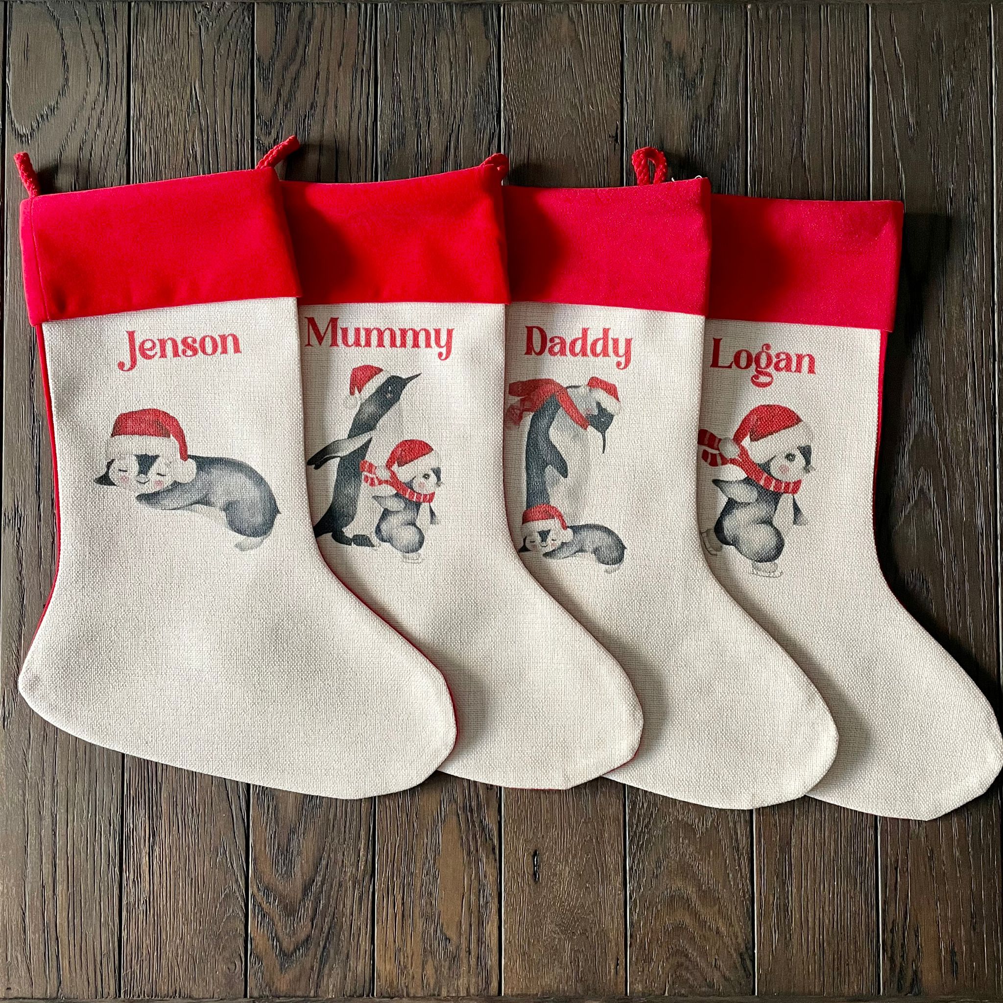 Personalised Red Penguins Christmas Stocking – Set of 4